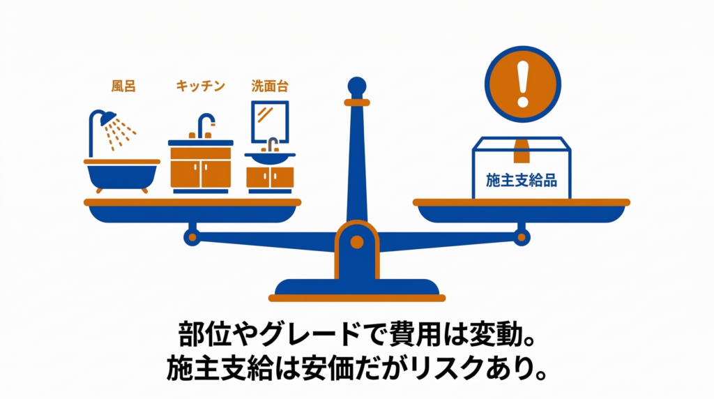 サイズが合わず下地からやり直す追加工事が発生したり、部品が足りず工期がストップするリスクがあります。さらに、万が一水漏れが起きた際、「製品の初期不良」なのか「施工業者の取り付けミス」なのか責任の所在が曖昧になり、業者の保証対象外となるケースが多くあります。