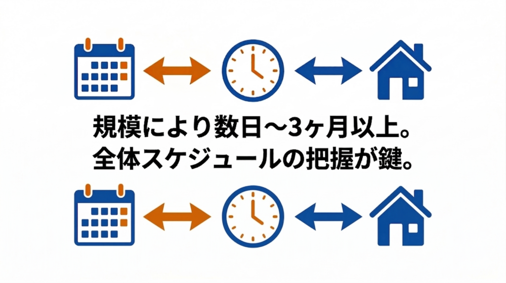 業者との初回打ち合わせから、プランの決定、資材の発注、管理組合への申請などを含めると、実際の工事日数の倍以上の時間がかかることも珍しくありません。