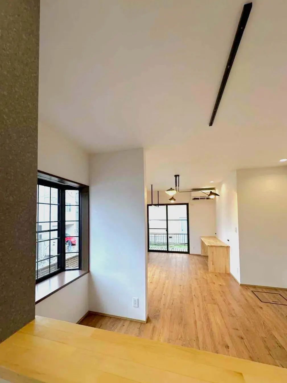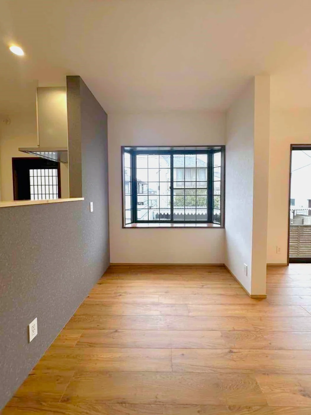 ダイニングに座った際に目線も光も通るよう、キッチン側にあった吊戸棚を撤去させていただきました。