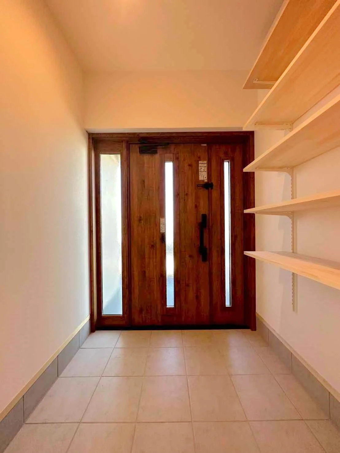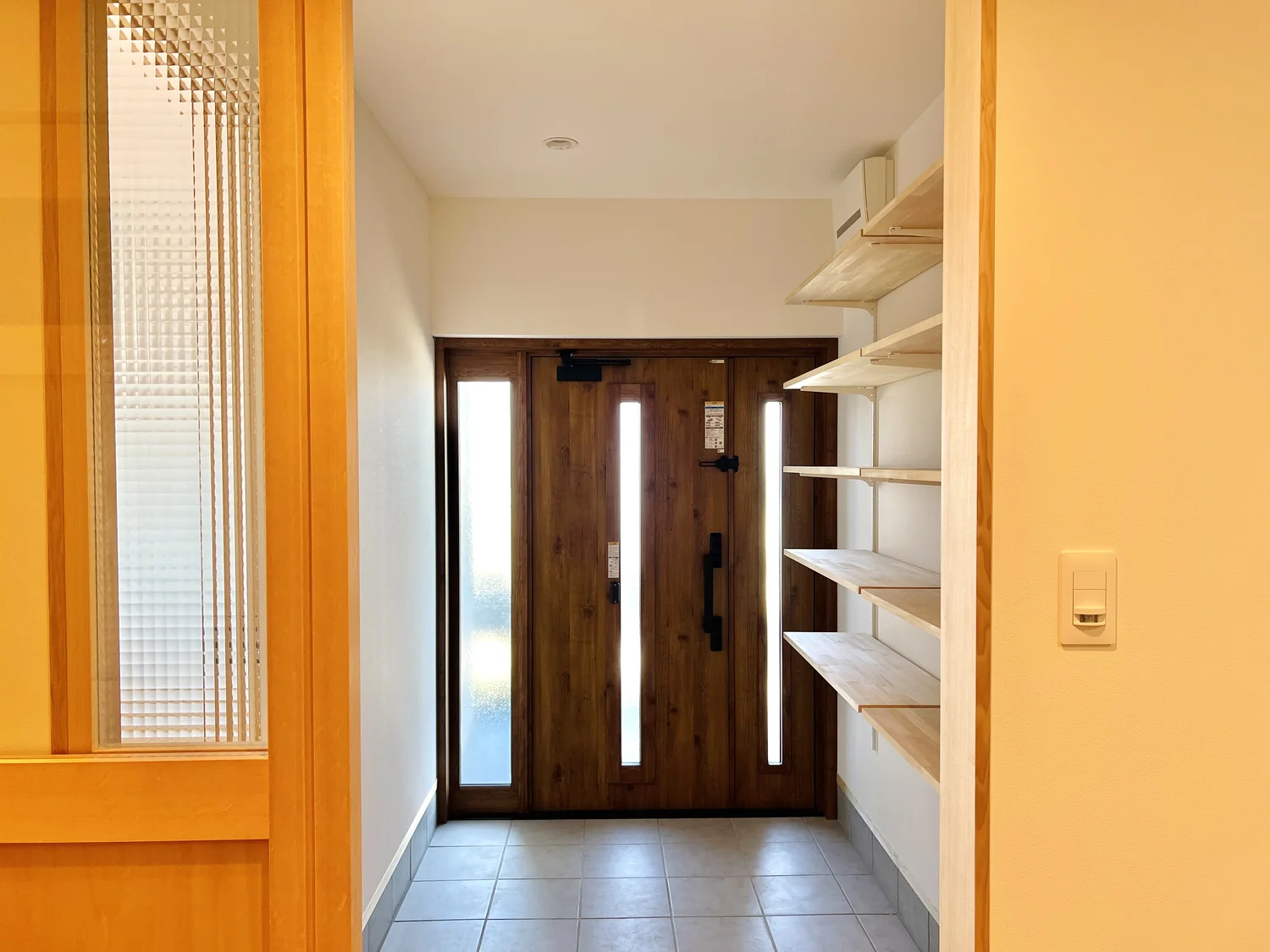 デザイン面では採光タイプを選び、玄関に自然光を取り入れつつ、ドアを閉めたままでも換気ができる仕様に。内装の雰囲気に合わせた木目調で、空間全体に調和をもたせました。