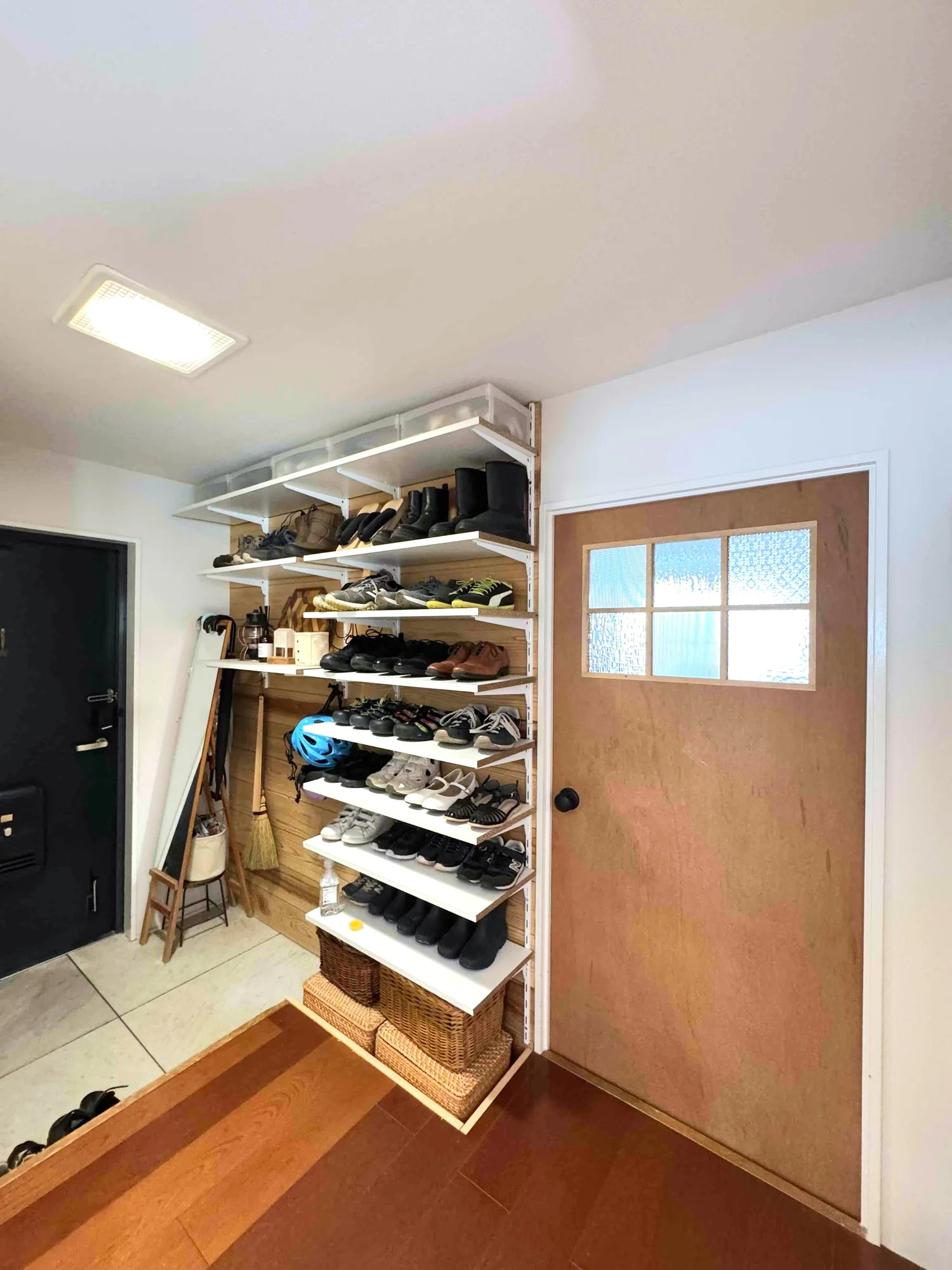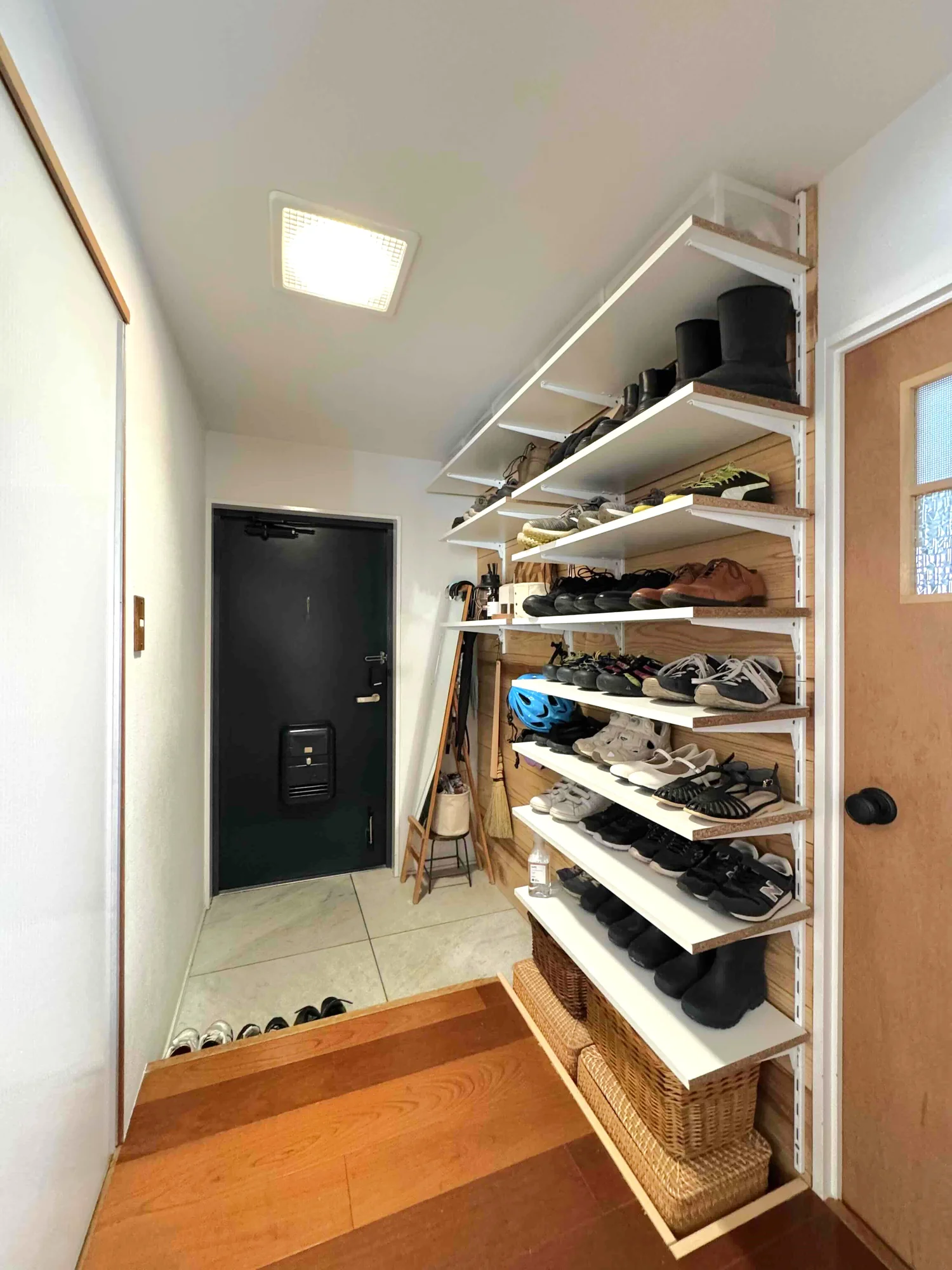 既存の扉付きの靴箱を撤去し、可動式のオープン収納を造作しました。