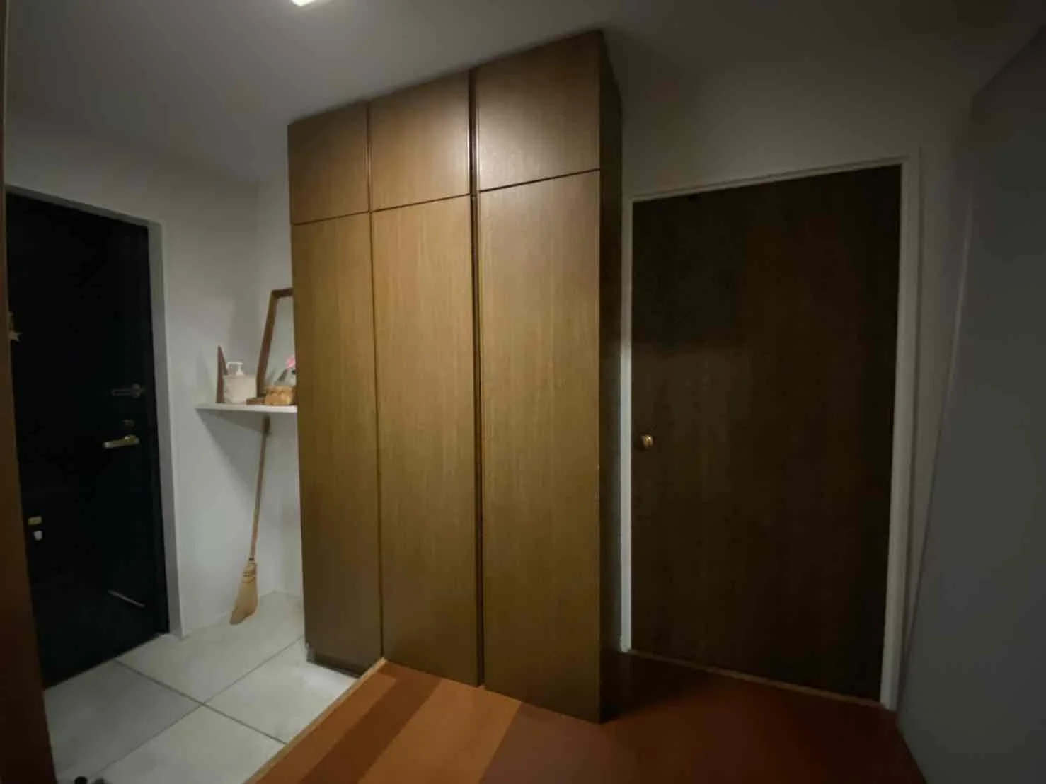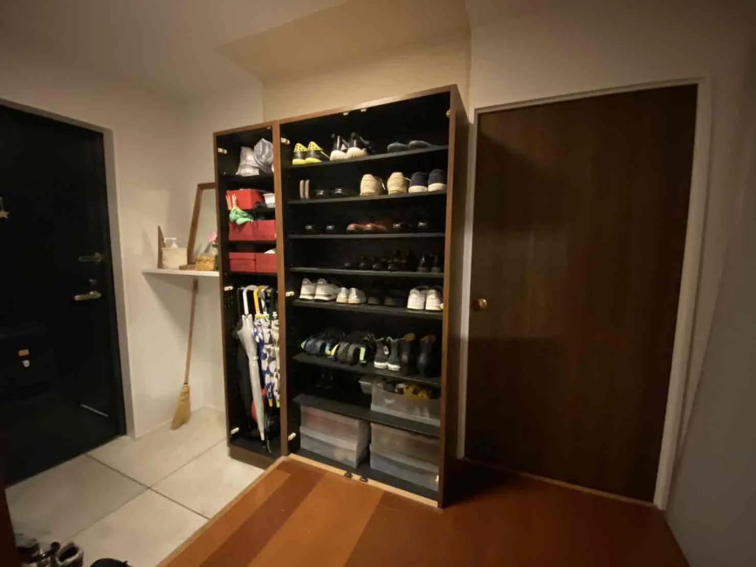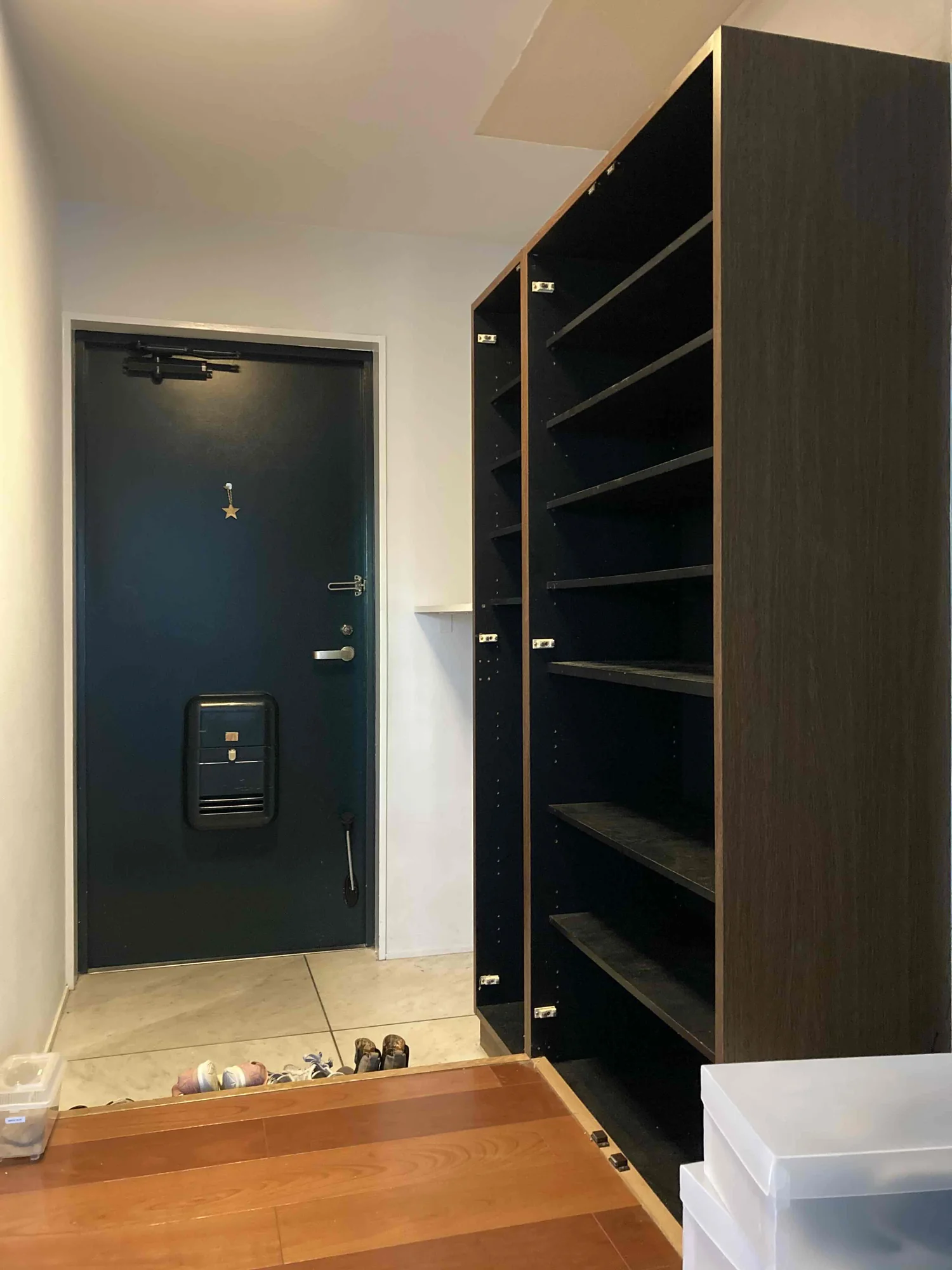 圧迫感のある靴箱をどうにかしたい。暗くて狭いの明るくで広くも見せたい。