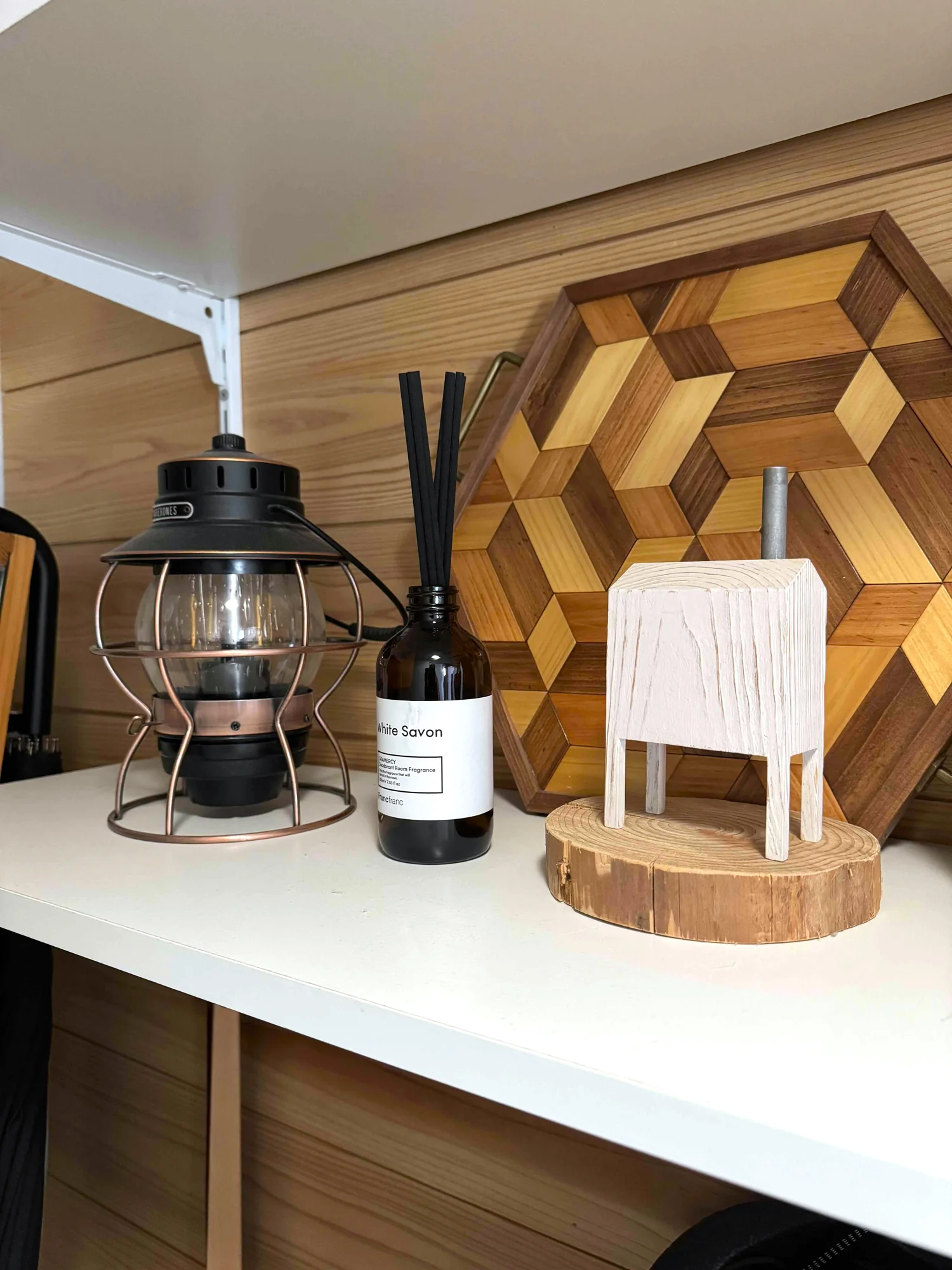 無機質な棚に木目が映えるアクセントにも。