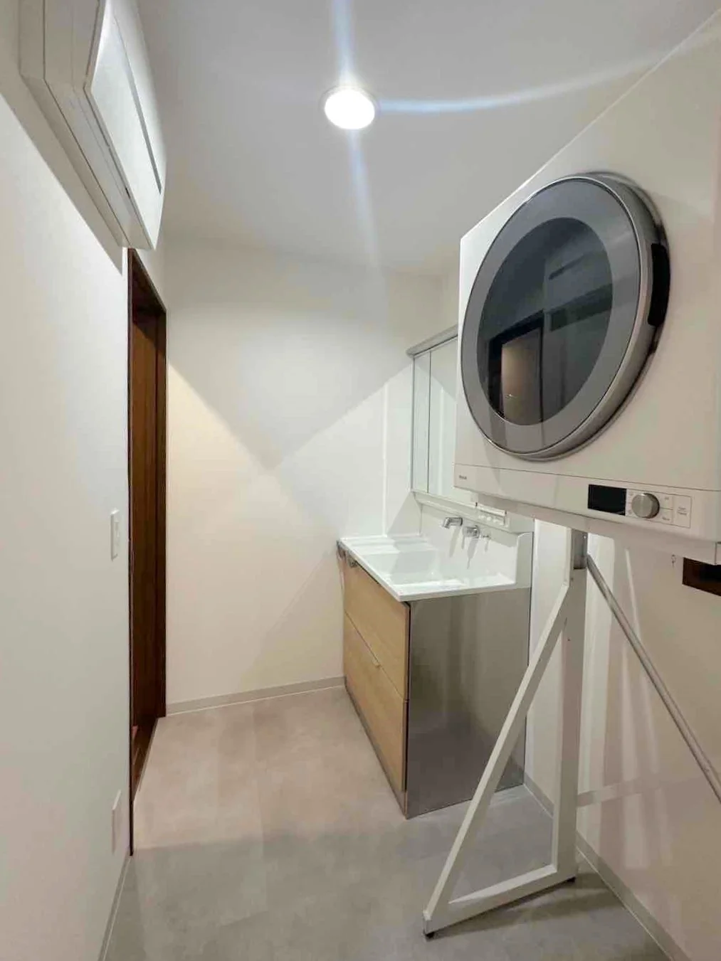 洗面下の収納は、施主様が使いたい収納用品に合わせて棚板の高さや奥行きを調整。仕上げにはモールテックスを採用し、キッチンとの雰囲気を統一することで、住まい全体のデザインに調和をもたらしています。